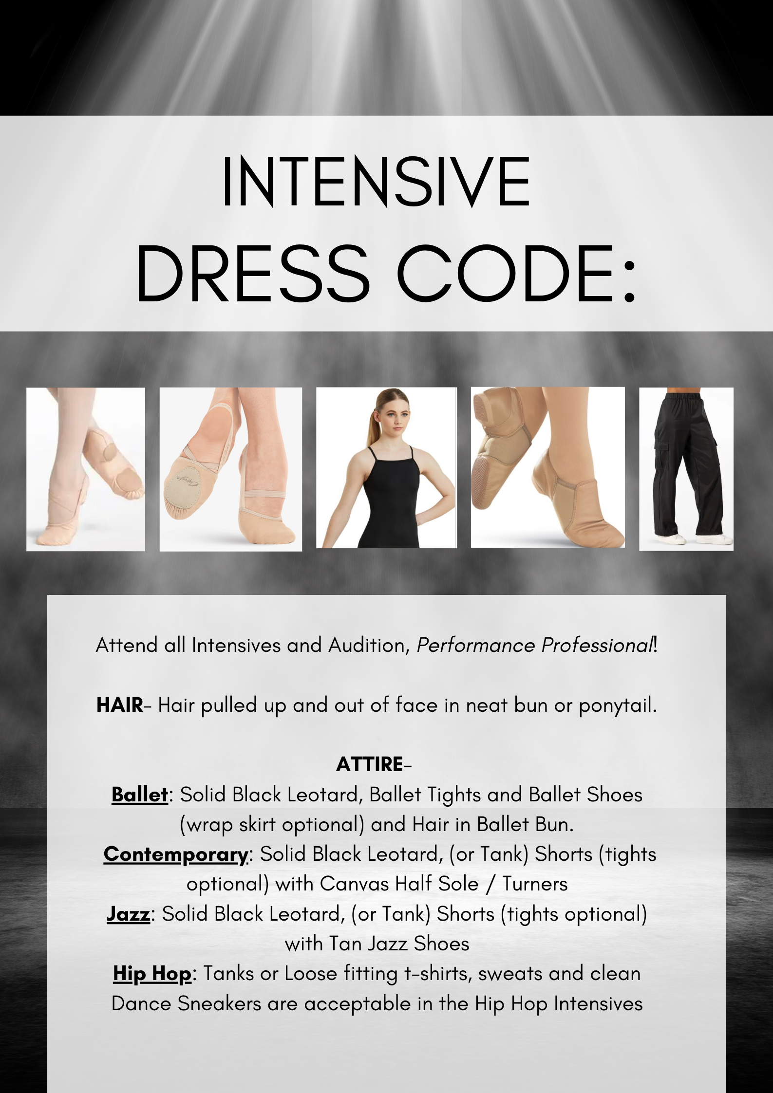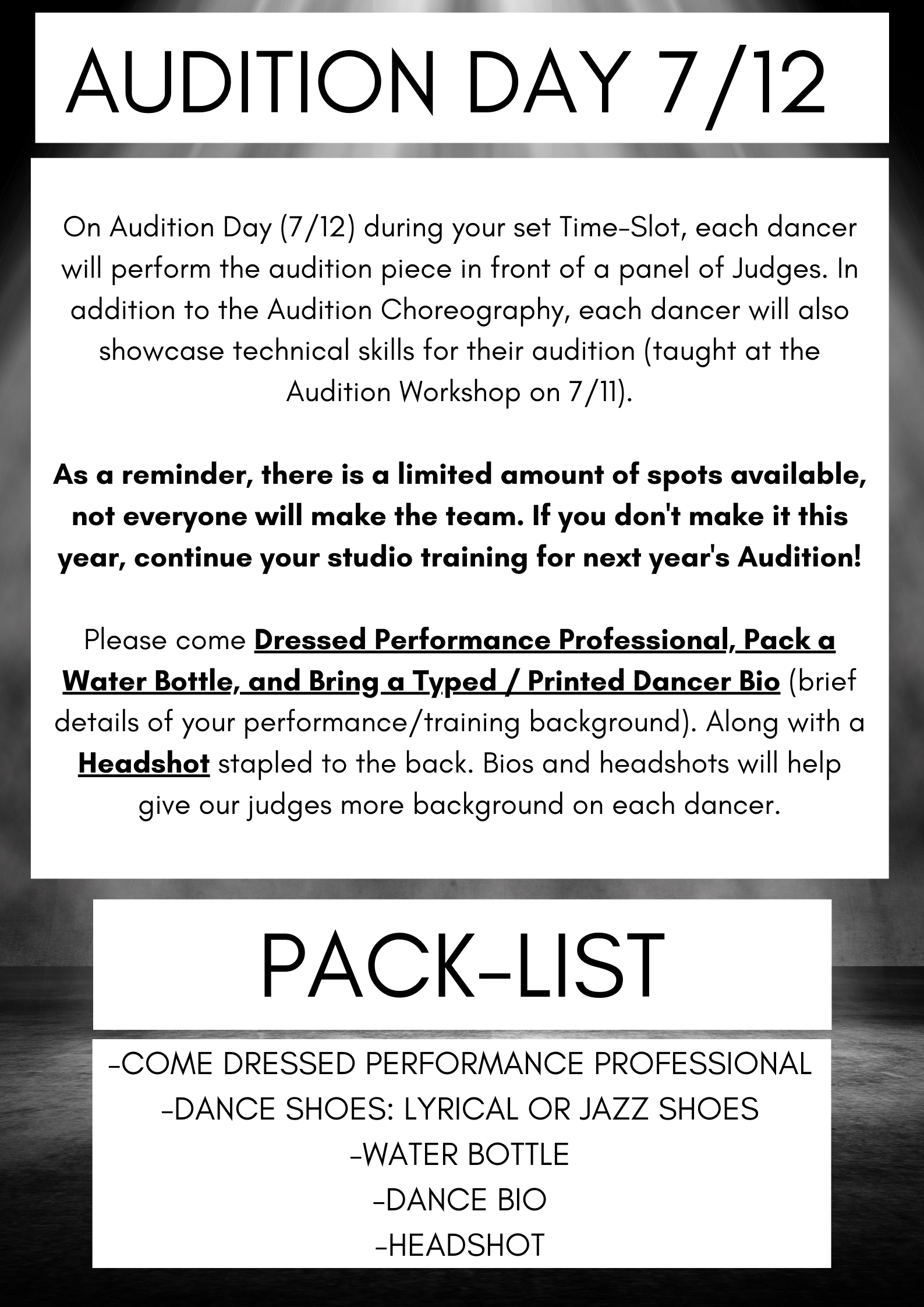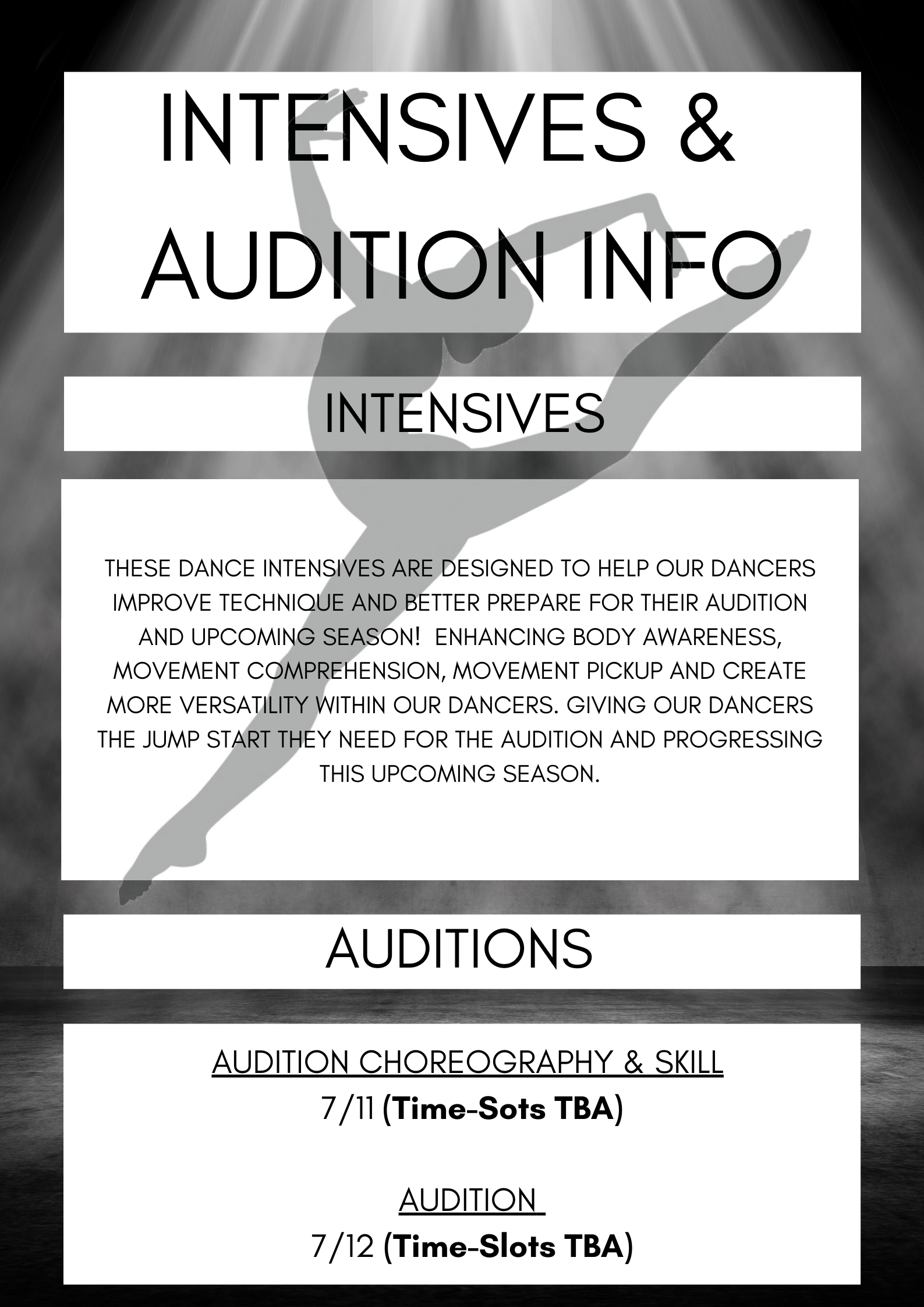 It is highly recommended that your dancer participates in the Intensives prior to Auditioning. Your dancer will be placed in the appropriate level based on current skill and age. Please be mindful that there is always a chance that dancers may not make the team or move up a level. Everyone has an equal opportunity in the Audition Process.